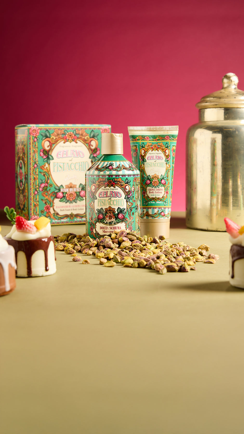<b>Caja de Regalo con Gel de ducha 500 mL + Crema Corporal Hidratante 200 mL</b></br>Edición Gourmand</br><i>Helado de Pistacho</i>