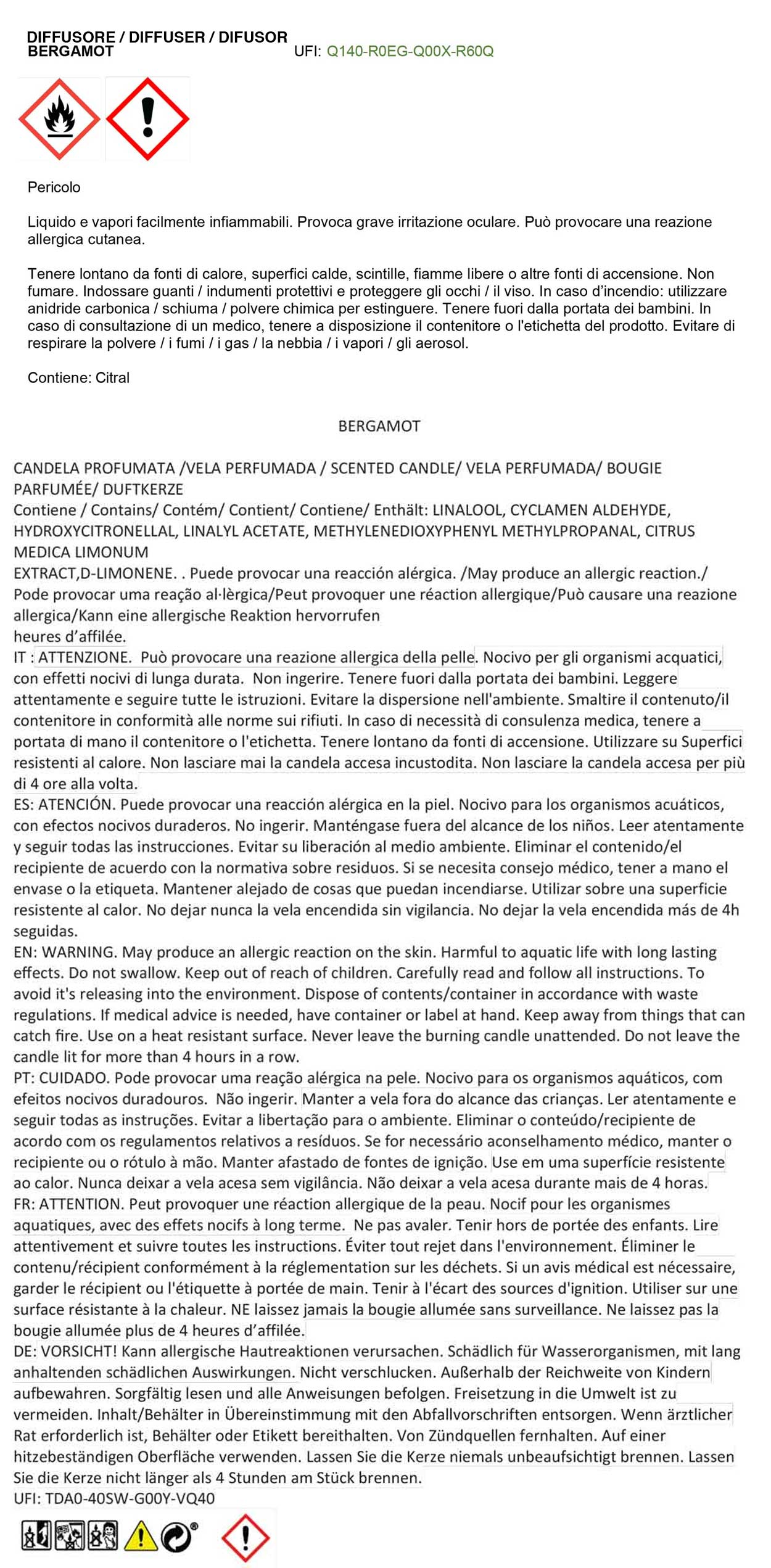 Recommendations for use and warnings Diffuser: